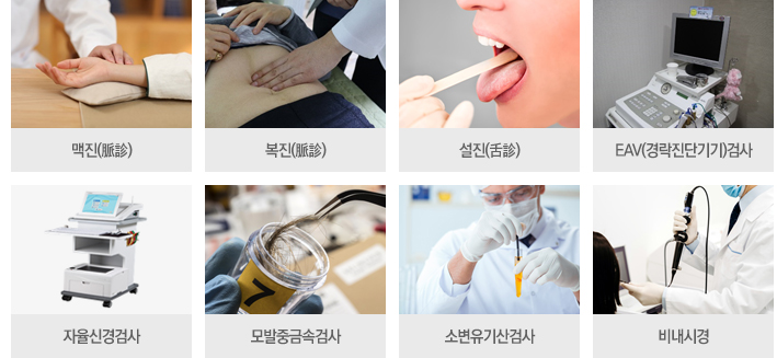 맥진(脈診), 복진(腹診), 설진(舌診), EAV(경락기능검사)