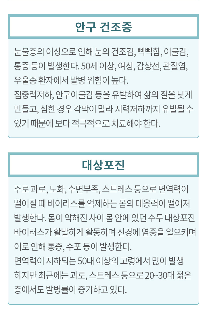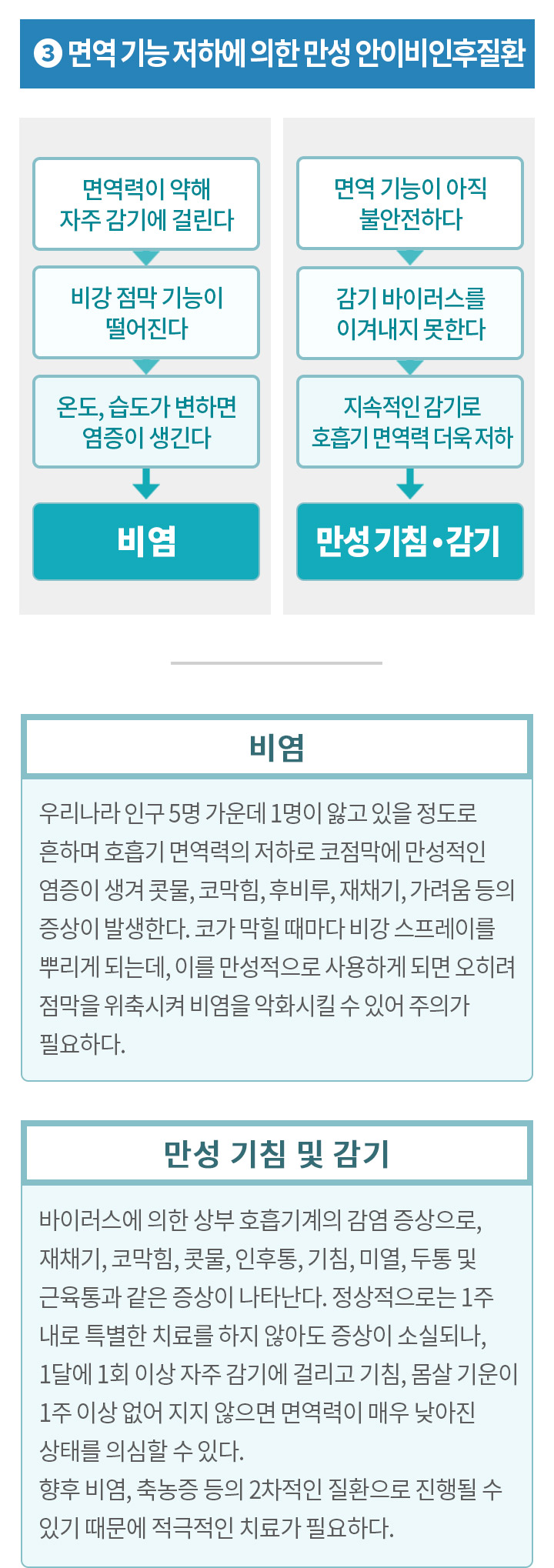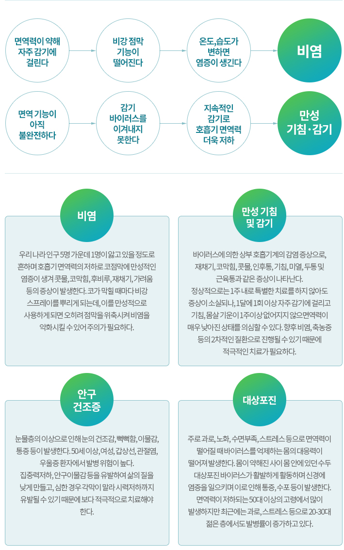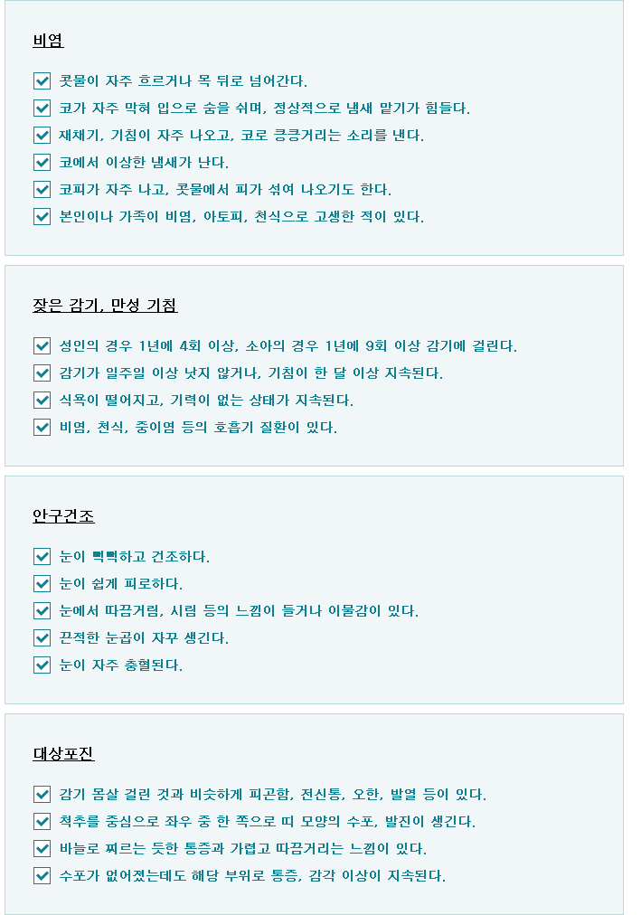 주요증상 : 잦은 감기, 안구건조, 두통, 목 이물감