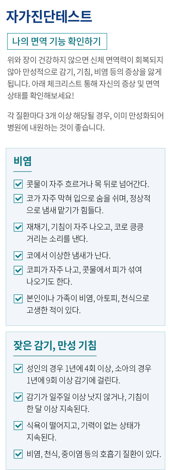위와 장이 건강하지 않으면 신체 면역력이 회복되지 않아 만성적으로 감기, 기침, 비염 등의 증상을 앓게 됩니다. 아래 체크리스트 통해 자신의 증상 및 면역 상태를 확인해보세요!