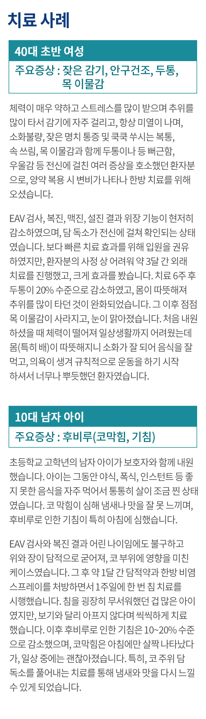 EAV 검사, 복진, 맥진, 설진 결과 위장 기능이 현저히 감소하였으며, 담 독소가 전신에 걸쳐 확인되는 상태였습니다. 보다 빠른 치료 효과를 위해 입원을 권유하였지만, 환자분의 사정 상 어려워 약 3달 간 외래 치료를 진행했고, 크게 효과를 봤습니다. 치료 6주 후 두통이 20% 수준으로 감소하였고, 몸이 따뜻해져 추위를 많이 타던 것이 완화되었습니다. 그 이후 점점 목 이물감이 사라지고, 눈이 맑아졌습니다. 처음 내원하셨을 때 체력이 떨어져 일상생활까지 어려웠는데 몸(특히 배)이 따뜻해지니 소화가 잘 되어 음식을 잘 먹고, 의욕이 생겨 규칙적으로 운동을 하기 시작하셔서 너무나 뿌듯했던 환자였습니다.