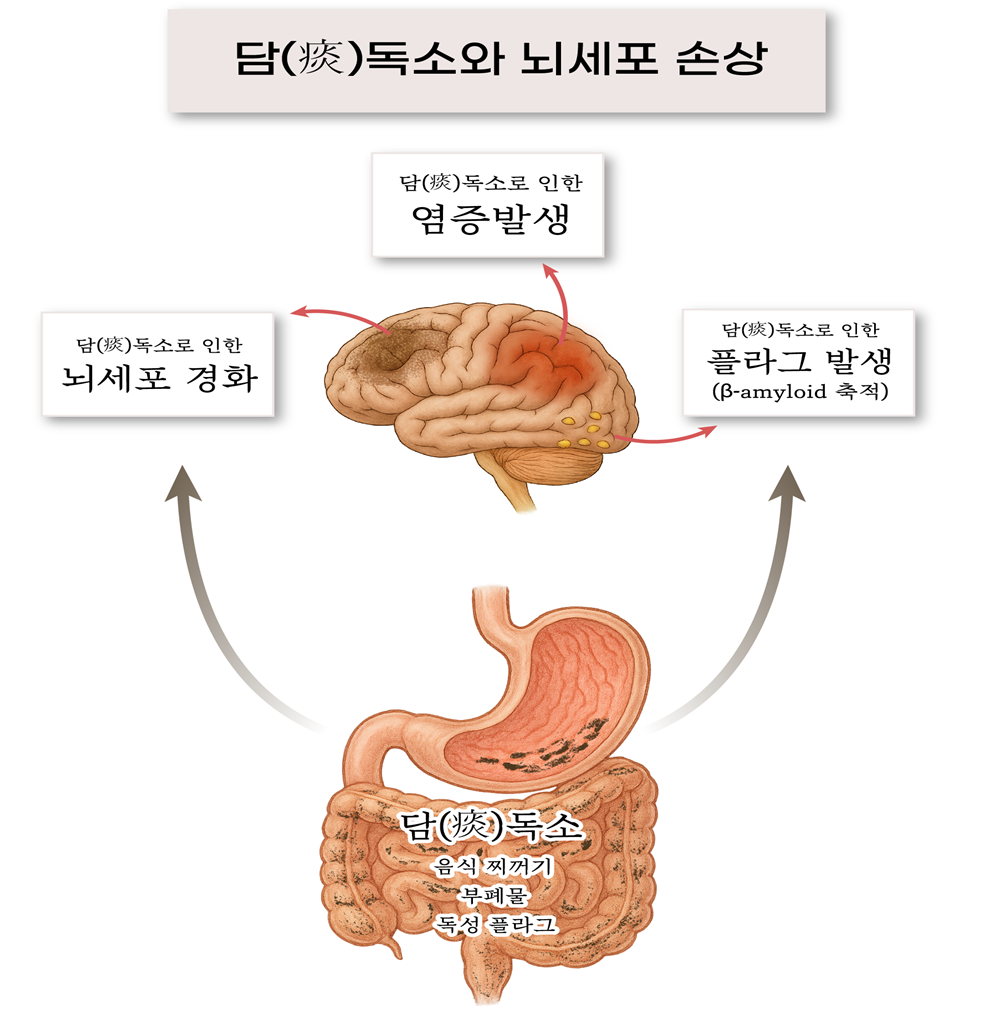 ‘담 독소’란 위와 장에서 음식이 제대로 소화되지 못하고 부패하면서 생기는 점성이 강한 독성 물질로, 이 물질이 장벽을 통과해 혈류로 이동하면 뇌의 염증 반응과 단백질 대사 이상을 일으킵니다.