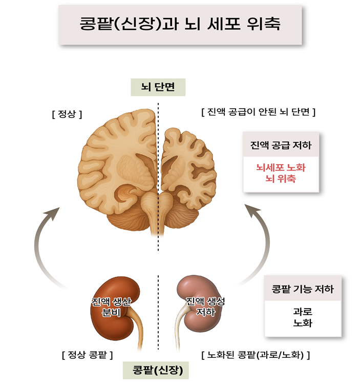 그런데 과로, 노화, 스트레스 등으로 신장의 기능이 약해지면 진액을 충분히 만들어내지 못하고, 그 결과 뇌로 올라가는 뇌척수액 순환이 줄어듭니다.
