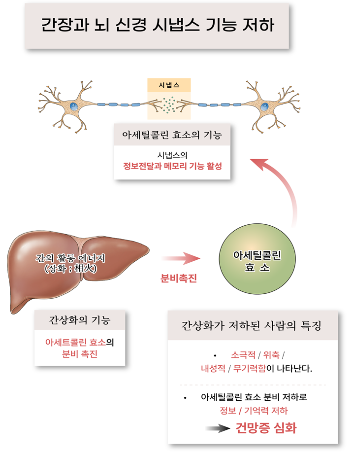 과로, 과음, 불규칙한 생활, 혹은 활동량이 적고 의욕이 떨어진 사람들은 간상화가 쉽게 약해지고, 그 결과 아세틸콜린 분비가 줄어들어 시냅스 정보 전달 기능이 저하됩니다.