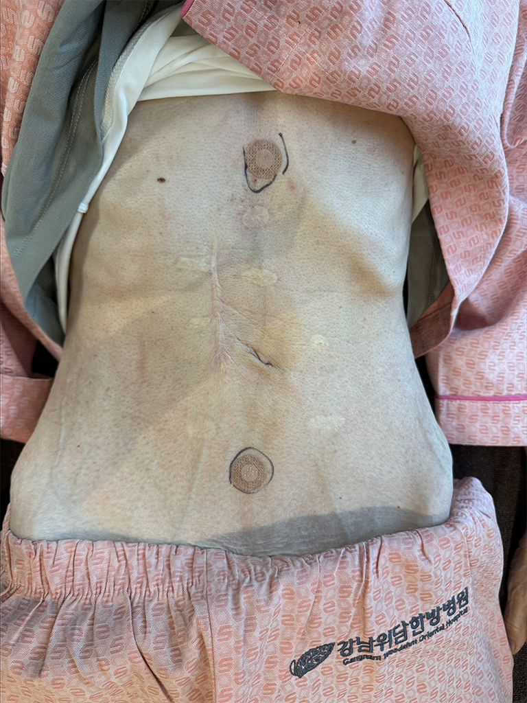 해독기능이 강한 성분의 한약재를 도포하여 명치의 체기를 풀어주고 위, 소장, 대장 부위의 응어리진 담적을 녹여주는 치료법입니다.