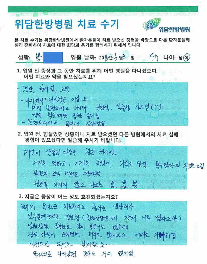 [역류성 식도염, 목디스크, 소화불량 /47세] 박OO님 치료수기