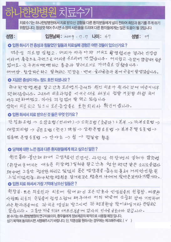 [역류성식도염, 두통, 알레르기, 체기 /47세] 박OO님 치료수기