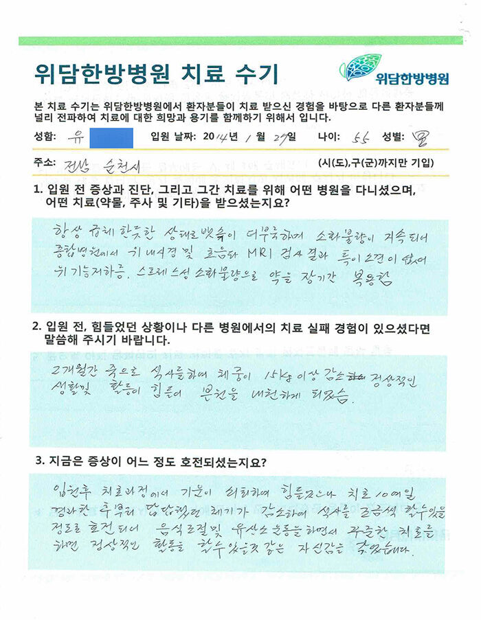 [위기능저하증, 스트레스성 소화불량/55세] 유OO님 치료수기