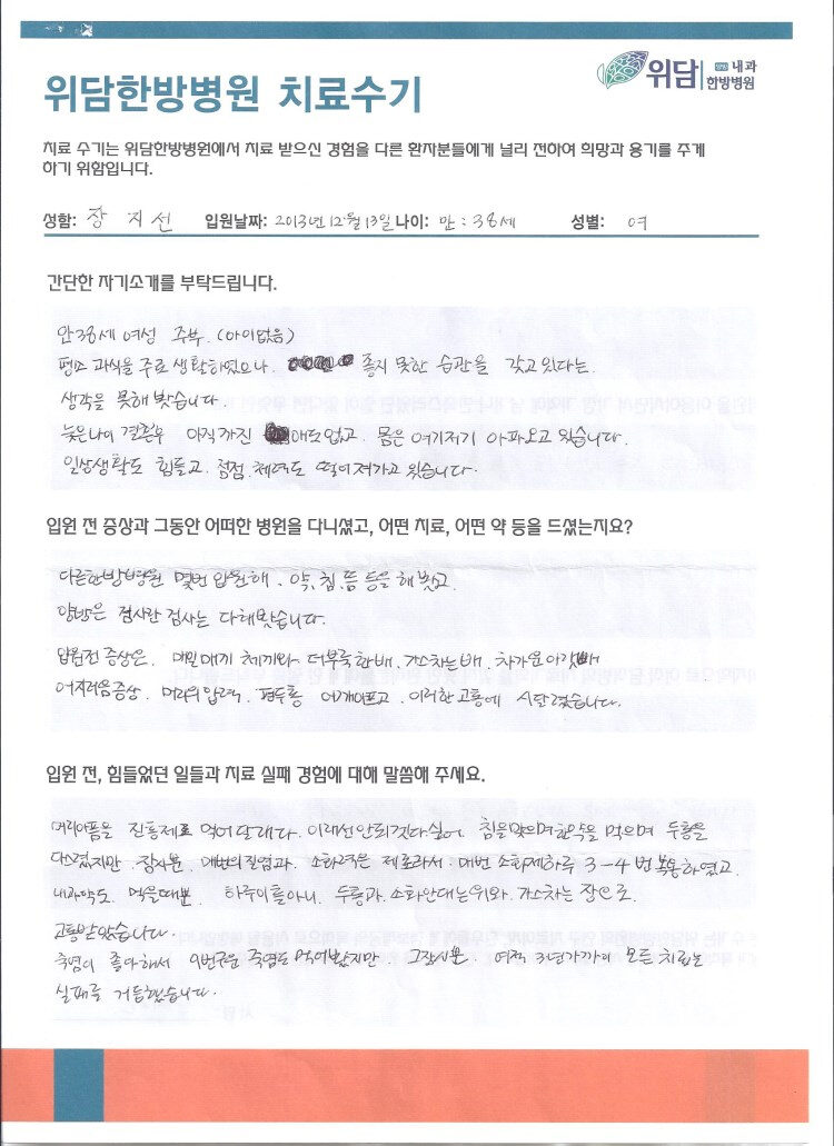 [체기, 더부룩, 편두통, 어깨통증 /38세] 장OO님 치료수기