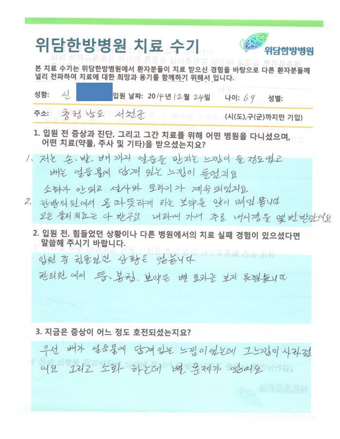 [수족,복부 냉증, 소화불량/69세] 신OO님 치료 수기