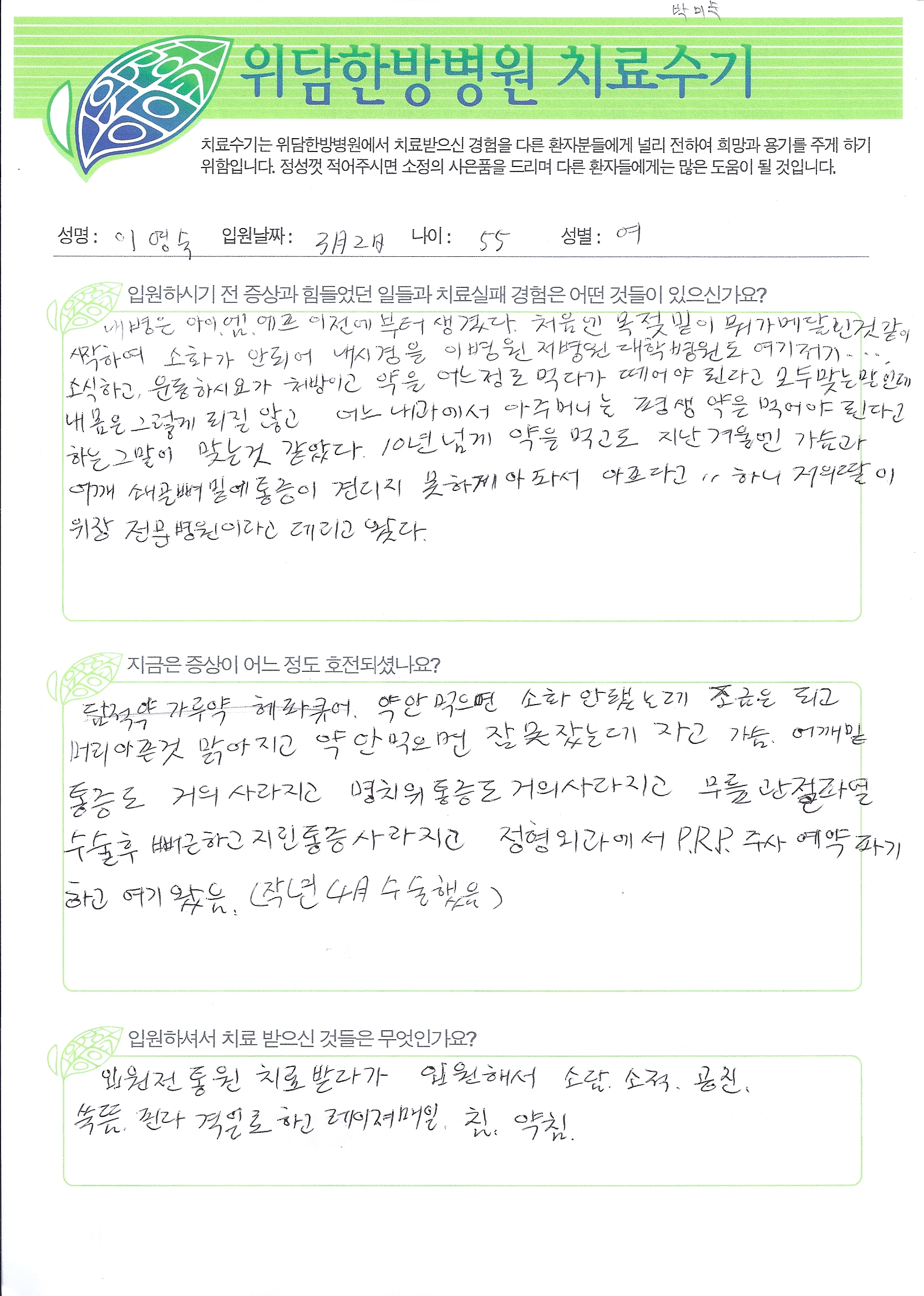 환자 치료 후기