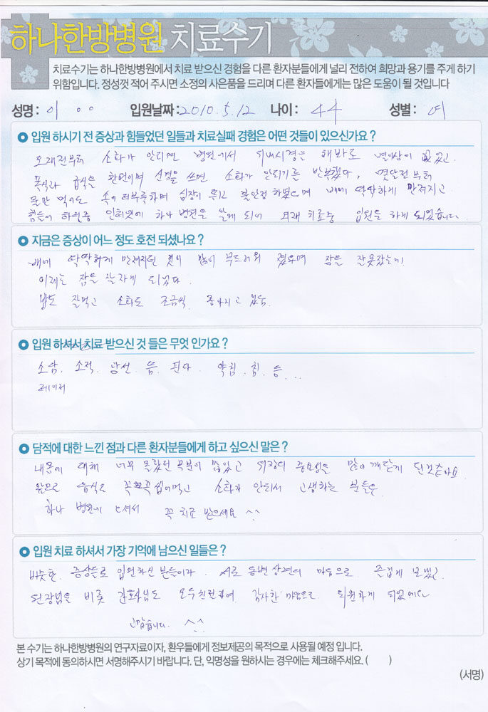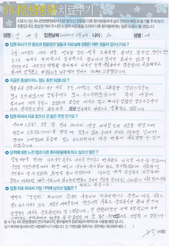 [두통, 이명, 역류, 불안감, 갱년기 /50세] 김OO님 치료수기