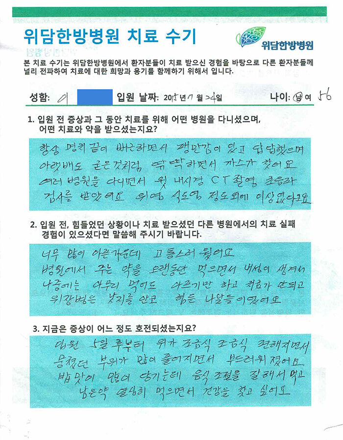[팽만감, 아랫배 굳음, 식도염, 가스 /56세] 이OO님 치료수기
