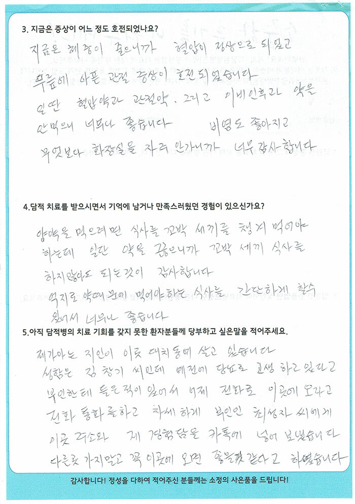[복부팽창, 관절염, 알레르기비염 등] 강경자님 치료수기