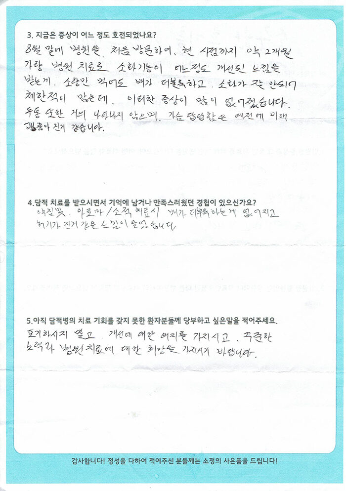 [과민성대장증후군, 가슴 답답, 두통 등] 이병주 님 치료수기