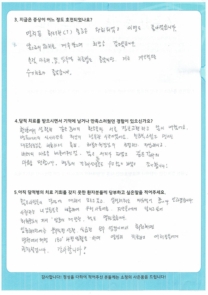 WEEDAHM ORIENTAL HOSPITAL 치료사례REVIEW 위담한방병원에서 행복을 찾은 분들의 이야기입니다. 본 치료사례는 의료법상 로그인 후 열람하실 수 있습니다.