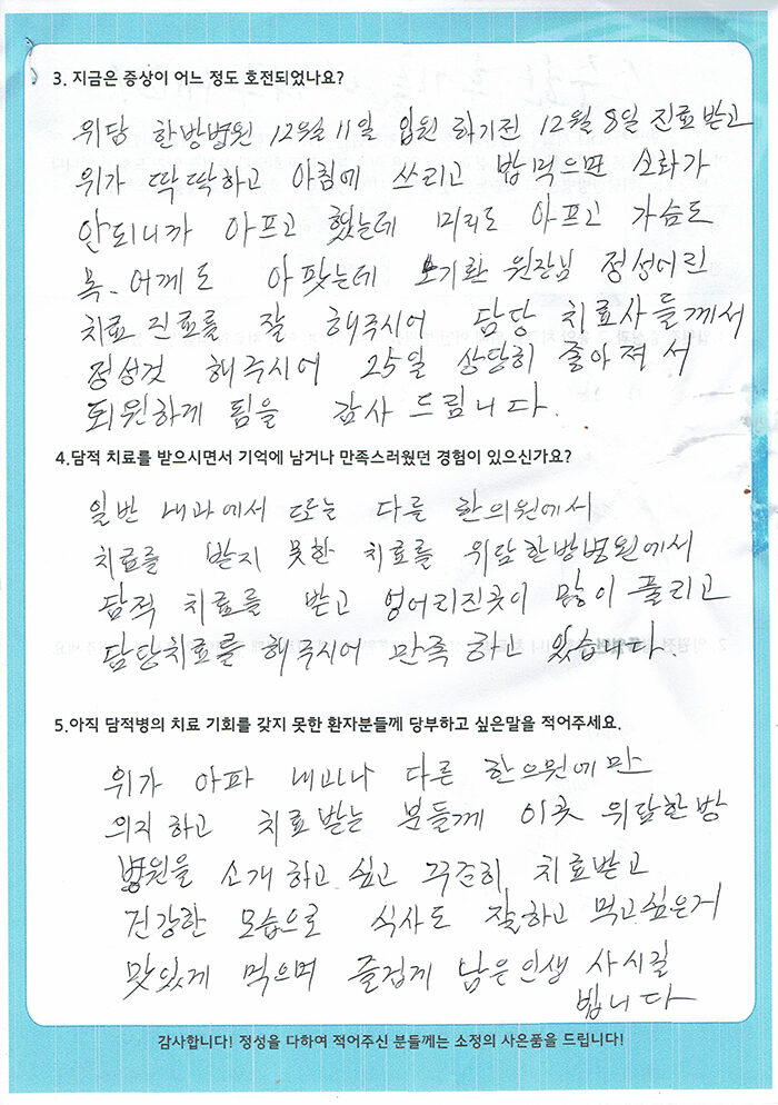 [속 쓰림, 가슴통증, 잦은 체기 등] 김정봉 님 치료수기