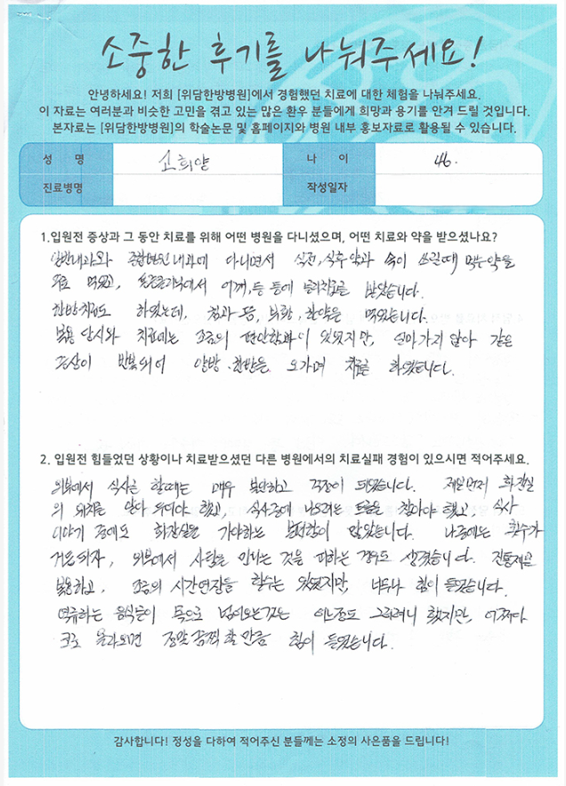WEEDAHM ORIENTAL HOSPITAL 치료사례REVIEW 위담한방병원에서 행복을 찾은 분들의 이야기입니다. 본 치료사례는 의료법상 로그인 후 열람하실 수 있습니다.