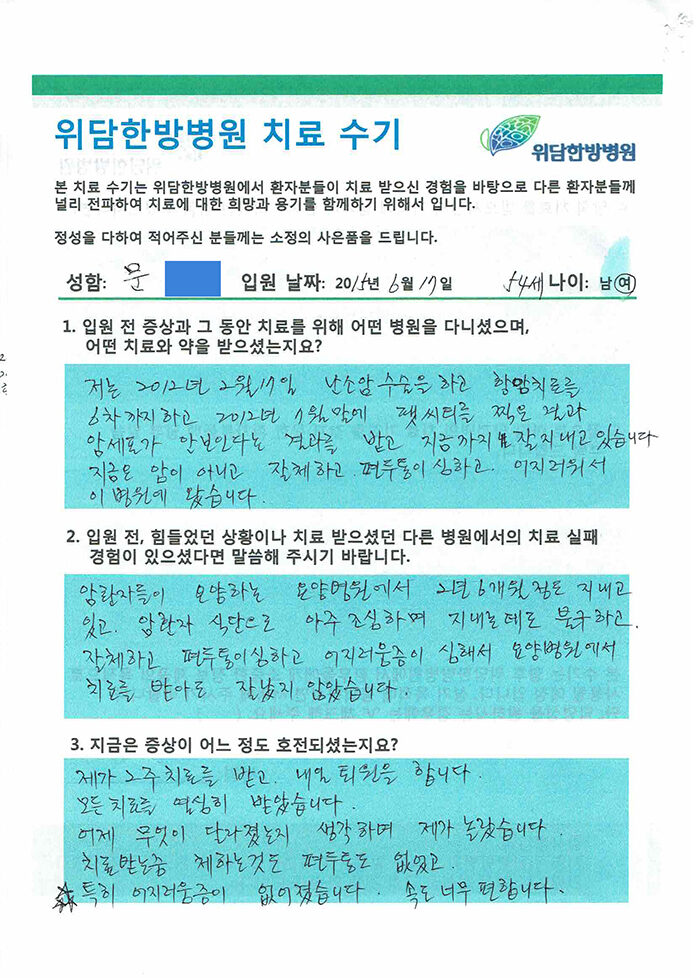 [난소암, 편두통, 어지럼증 /54세] 문OO님 치료수기