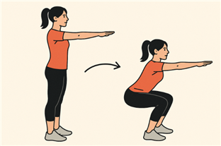 - 무릎이 발끝 앞으로 나가지 않게 하며 엉덩이를 뒤로 내리며 앉는 자세를 취합니다.