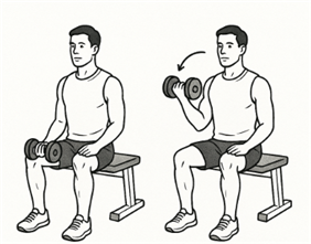 - 손바닥이 앞을 향하게 해서 아령을 들어 올립니다. 이 때, 어깨가 들리지 않도록 주의합니다.