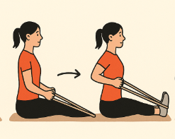 - 매트에 앉아 탄력 밴드를 발바닥에 고정시킵니다.
