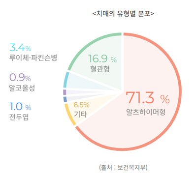종류 : 알츠하이머 치매(전체 치매의 약 70%), 혈관성 치매(전체 치매의 약 17%), 기타(huntington병, pick병, creutzfeldt-jakob병, 두부 외상〮감염성 질환 등에 의한 치매 등)
