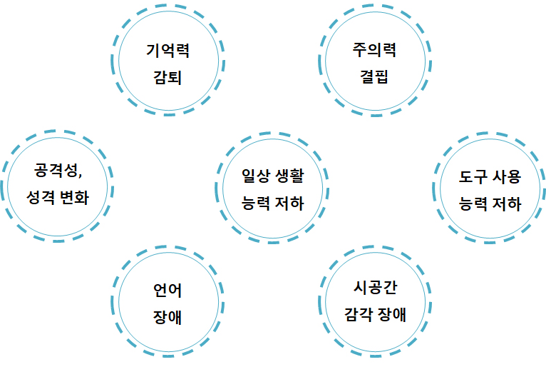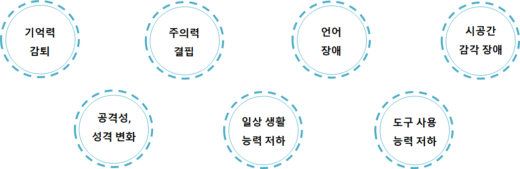 다발성 인지기능 장애로, 초기 기억력 감소가 나타나며 이후 인지기능 저하, 행동심리증상, 일상생활능력 저하가 나타나 일상생활이나 사회생활에 지장을 일으키는 질환