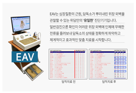 독일의 의공학자 Dr. Voll에 의해 고안된 진단기기로, 장부의 기능적 문제와 서양의학의 종합검진으로 나타나지 않는 문제들을 찾아냅니다. EAV는 서양의학의 생물학적 이론과 한의학의 경락 이론을 접목하여 고안된 최첨단의 기능 진단기기(위와 장 외벽의 상태를 관찰하는 유일한 진단기기)로써 내시경에 보이지 않는 위장의 문제들을 찾아냅니다.